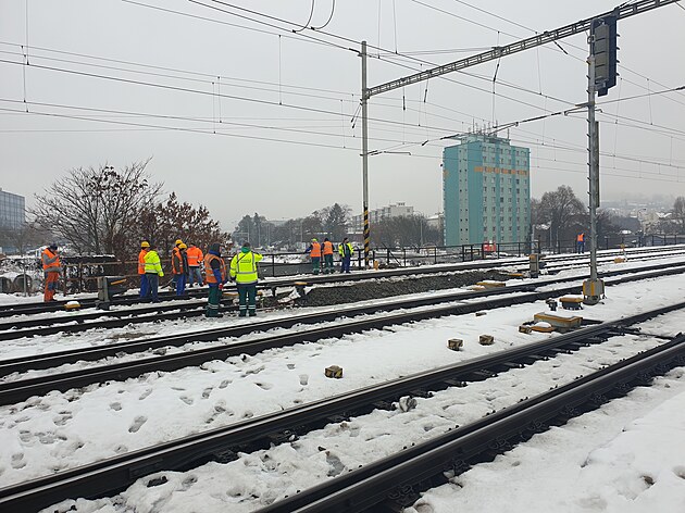 Dělníci pracují na poškozeném mostě, aby na něj mohli umístit provizorní konstrukci. Díky ní tudy opět pojedou vlaky. (23.12.2022)