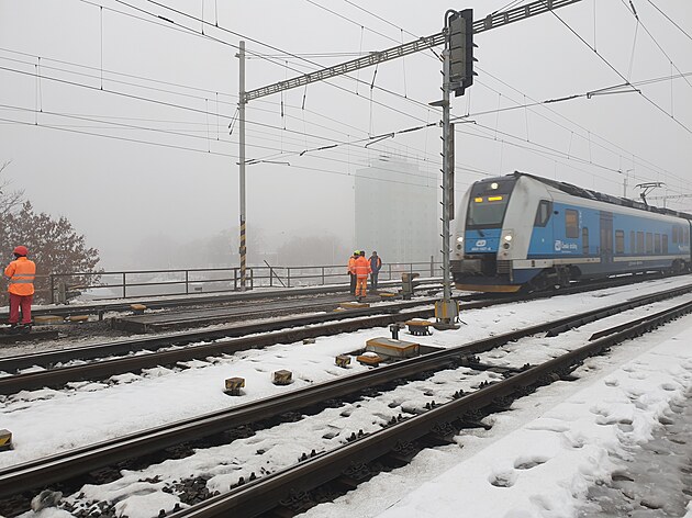 Dělníci usazují provizorní mostní konstrukci. Vlaky zatím jezdi omezeně po jedné koleji. (23.12.2022)