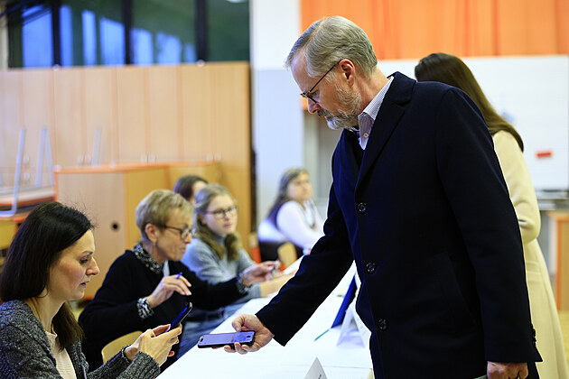 Premiér Petr Fiala (ODS) u doplňovacích senátních voleb v Brně. Voliči se mohli vůbec poprvé prokázat eDokladem. (17. listopadu 2025)