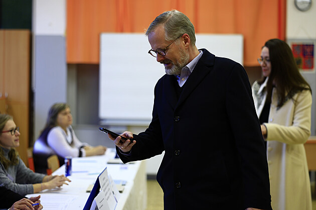 Premiér Petr Fiala (ODS) u doplňovacích senátních voleb v Brně. Voliči se mohli vůbec poprvé prokázat eDokladem. (17. listopadu 2025)