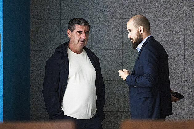 Goran Veljković (vlevo), zapojený do bytové kauzy v brněnských Řečkovicích a Mokré Hoře, u brněnského soudu. (9. července 2025)