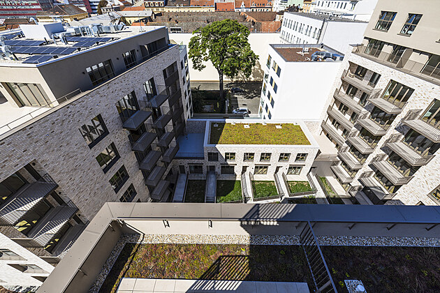 Bytový komplex Pekárenský dvůr se od ostatních liší konceptem klubového bydlení. Obyvatelé mají k dispozici recepci, wellness, fitness, coworking. (srpen 2025)