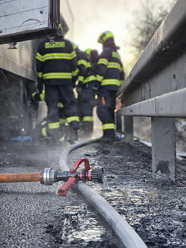 Dálnici D1 ve směru na Vyškov ochromil požár návěsu kamionu. (19. února 2025)