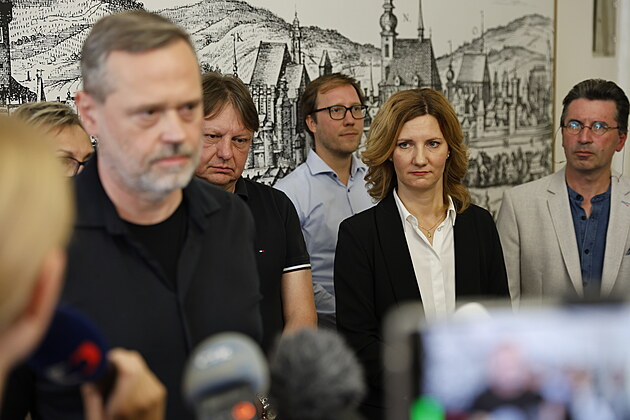 Brněnská primátorka Markéta Vaňková i její náměstek Robert Kerndl (na snímku v popředí) oznámili, že jejich test na drogy přinesl negativní výsledek. Koaliční partneři jim zároveň vyjádřili i přes aféru kolem fotky s bílým práškem podporu. (9. srpna 2023)