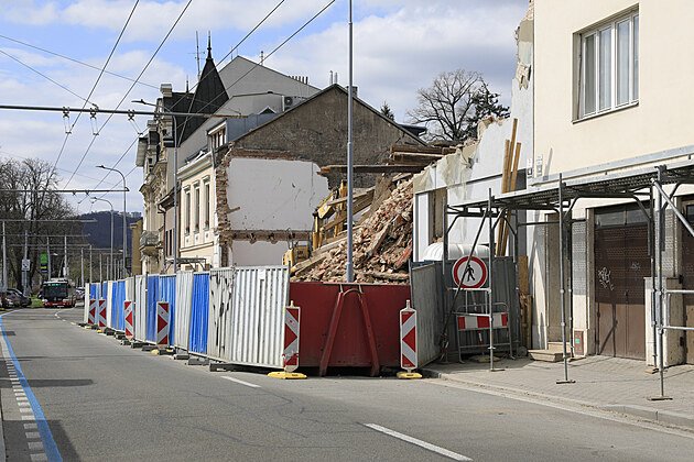 Poslední zbytky fasády a hlavně obrovská hromada suti zbyla ze čtveřice starých domů v historické ulici Hlinky vedle brněnského výstaviště. Nahradit je mají dvě sedmipatrové budovy. (1. dubna 2025)