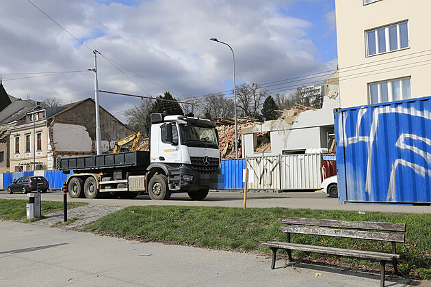 Poslední zbytky fasády a hlavně obrovská hromada suti zbyla ze čtveřice starých domů v historické ulici Hlinky vedle brněnského výstaviště. Nahradit je mají dvě sedmipatrové budovy. (1. dubna 2025)