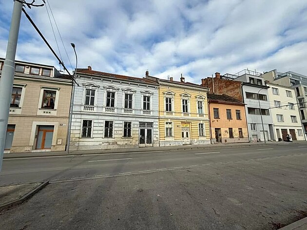 Původní čtveřice starých domů v brněnské ulici Hlinky, která musela ustoupit dvěma plánovaným sedmipatrovým budovám.