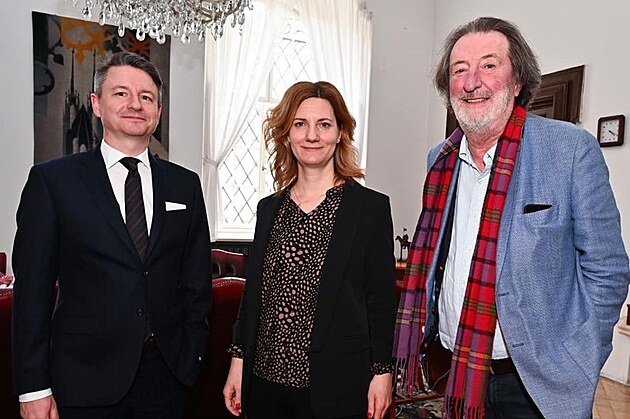 Brněnská primátorka Markéta Vaňková na jednání s Bolkem Polívkou (vpravo), který je ředitelem divadla pojmenovaného po něm, a Martinem Glaserem, který je ředitelem Národního divadla Brno.