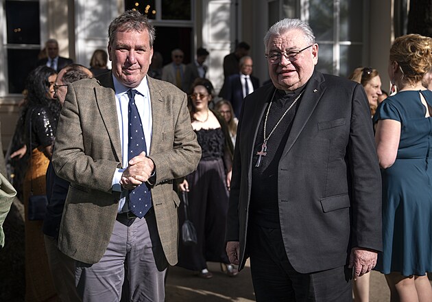 Kardinál Dominik Duka (vpravo) na britské ambasádě na pražské Malé Straně při oslavách narozenin krále Karla III. (11. června 2025)