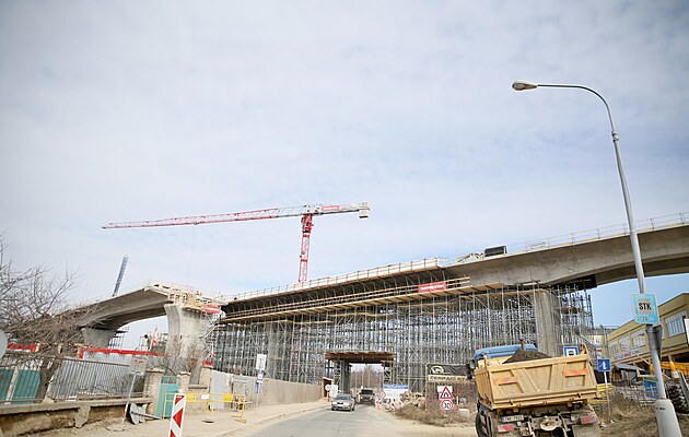 U Tomkova náměstí v Brně rostou první pilíře budoucí silniční estakády, další části velkého městského okruhu. (14. března 2022)