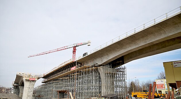 U Tomkova náměstí v Brně rostou první pilíře budoucí silniční estakády, další části velkého městského okruhu. (14. března 2022)