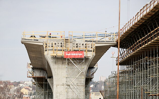 U Tomkova náměstí v Brně rostou první pilíře budoucí silniční estakády, další části velkého městského okruhu. (14. března 2022)