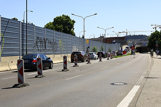 Podjezd u křižovatky Hlinky je kvůli opravě vodovodu uzavřený, veškerá doprava ve směru z Žabovřeské musí vrchem přes křižovatku. Na Žabovřeské se tak táhnou kolony. (11. srpna 2025)