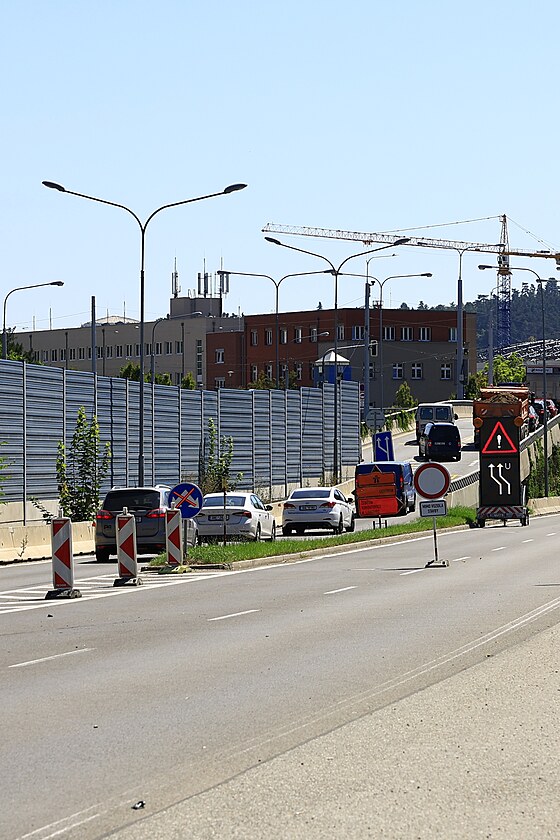 Podjezd u křižovatky Hlinky je kvůli opravě vodovodu uzavřený, veškerá doprava ve směru z Žabovřeské musí vrchem přes křižovatku. Na Žabovřeské se tak táhnou kolony. (11. srpna 2025)
