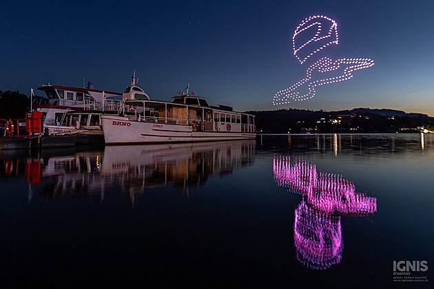 Drony vytvořily i obrys Masarykova okruhu doplněný závodnickou helmou na oslavu toho, že se do Brna v létě po pěti letech vrátí prestižní motocyklový závod MotoGP.