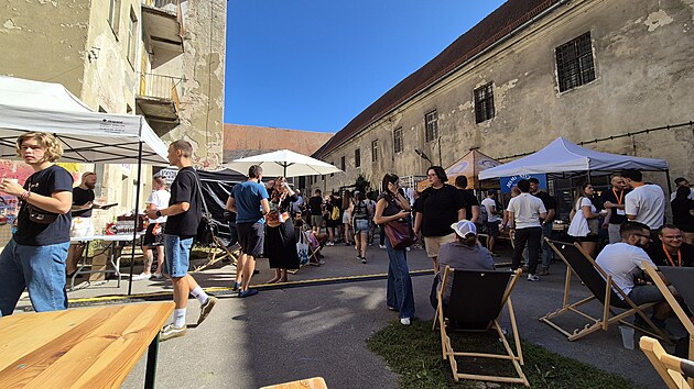 Na nádvoří to voní pikantní asijskou kuchyní. Je libo kimči burger nebo spíš závitky? Anebo něco sladkého? Na odbyt jdou skořicové pletence s kardamomem nebo ořechové baklavy z řecké pekárny Mama Stella.