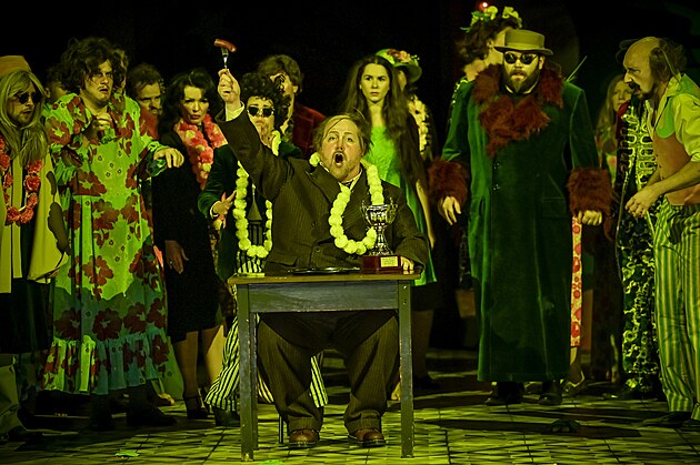 Nicky Spence jako Matěj Brouček v inscenaci Výlety páně Broučkovy na pódiu Národního divadla Brno. (2024)