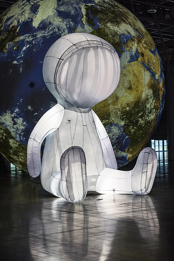 Ke čtyřem bronzovým sochám mimozemšťanů Fegurdů přibyl na brněnské hvězdárně také jeden obří nafukovací. (16. června 2025)