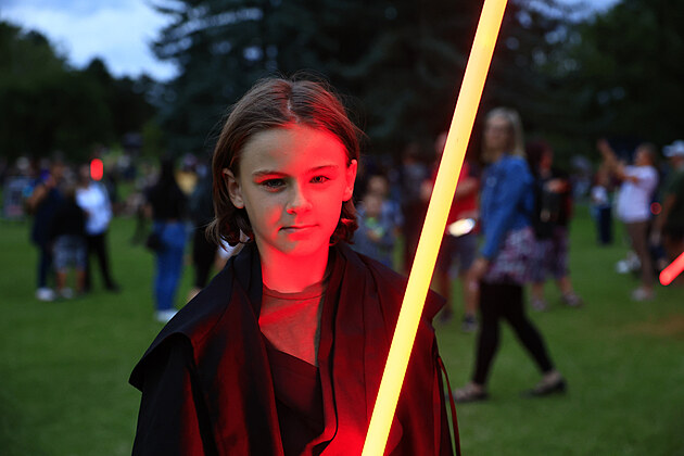 Milovníci scifi se sešli v úterý večer na festivalu Planet planet v parku na Kraví hoře u brněnské hvězdárny. Na sobě měli kostýmy z oblíbených filmů, přinesli si také svítící doplňky, hlavně světelné meče. (5. srpna 2025)