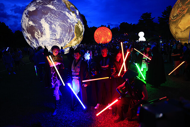 Milovníci scifi se sešli v úterý večer na festivalu Planet planet v parku na Kraví hoře u brněnské hvězdárny. Na sobě měli kostýmy z oblíbených filmů, přinesli si také svítící doplňky, hlavně světelné meče. (5. srpna 2025)