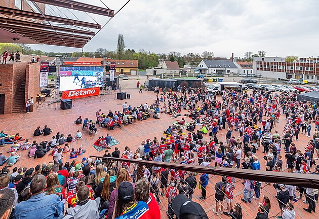 Do areálu Automatických mlýnů přišlo podpořit pardubické hokejisty v prvním finále extraligy proti brněnské Kometě několik stovek fanoušků. (17. dubna 2025)