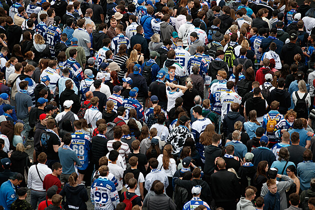 V Brně na Zelném trhu fandí hokejové Kometě ve finále proti Pardubicím tisícovky příznivců. (17. dubna 2025)