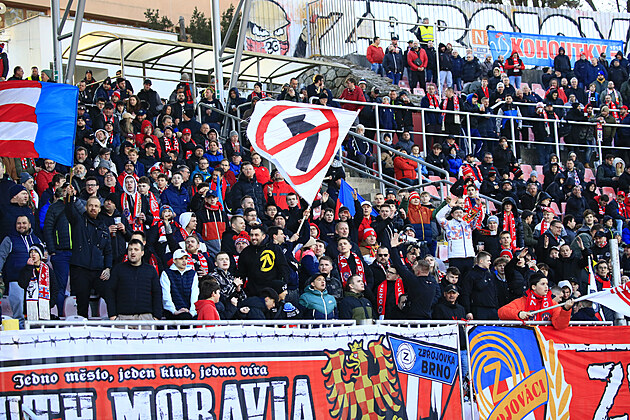 Fanoušci Zbrojovky Brno během druholigového zápasu proti Chrudimi. (1. března 2025)