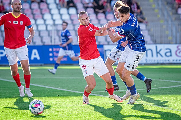 Denis Granečný ze Zbrojovky (vlevo) a Jan Silný z Líšně v souboji během vzájemného druholigového zápasu. (2024)