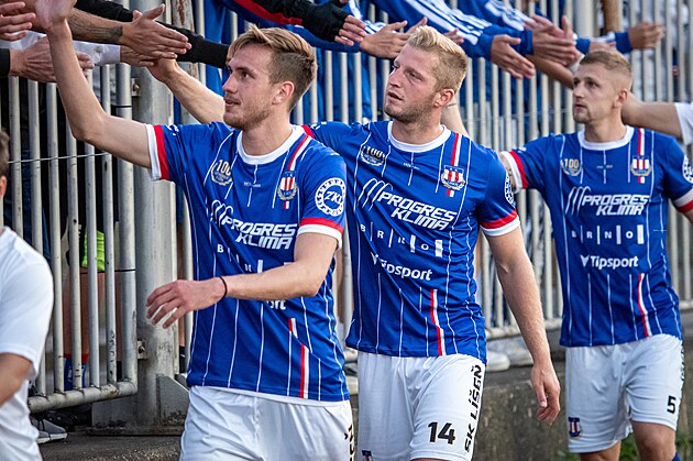 Fotbalisté Líšně se zdraví s fanoušky po derby na hřišti Zbrojovky Brno. (2024)