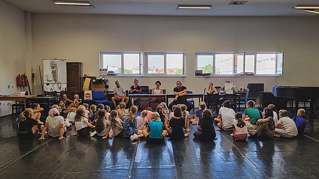 Adepti muzikálového herectví se v Brně připravují od loňského podzimu, vést je pomáhá i Eva Helbichová (na snímku za stolem v bílém).