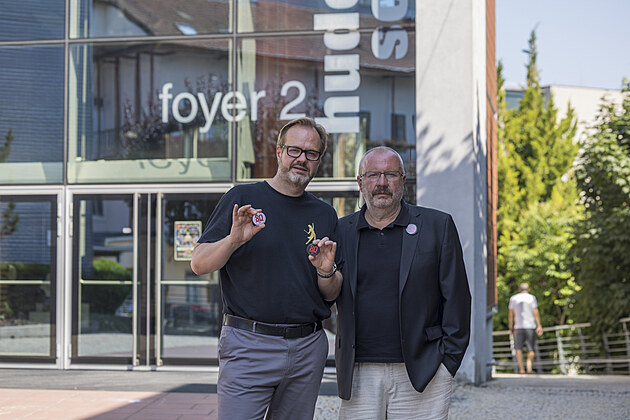 Zpěvák, herec a režisér Petr Gazdík (vlevo) a Stanislav Moša, ředitel a režisér Městského divadla Brno. (červen 2025)