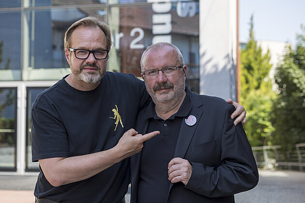 Zpěvák, herec a režisér Petr Gazdík (vlevo) a Stanislav Moša, ředitel a režisér Městského divadla Brno. (červen 2025)