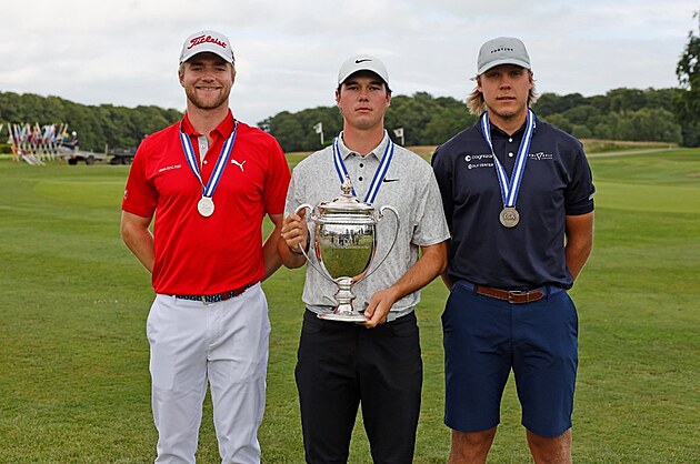 Filip Jakubčík (uprostřed) s pohárem pro amatérského mistra Evropy v golfu. (2025)
