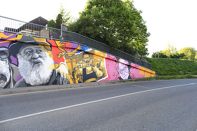 Nové graffiti na opěrné zdi v Šaracově ulici v brněnském Komíně znázorňuje osobnosti brněnské kulturní scény.