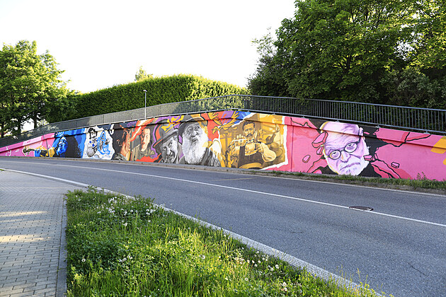 Nové graffiti na opěrné zdi v Šaracově ulici v brněnském Komíně znázorňuje osobnosti brněnské kulturní scény.