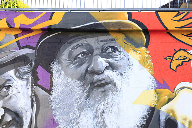Nové graffiti na opěrné zdi v Šaracově ulici v brněnském Komíně znázorňuje osobnosti brněnské kulturní scény. Na snímku Jiří Pecha.