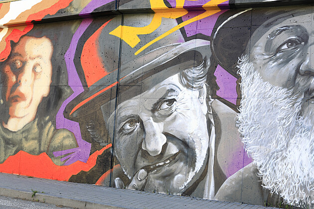 Nové graffiti na opěrné zdi v Šaracově ulici v brněnském Komíně znázorňuje osobnosti brněnské kulturní scény. Na snímku Bolek Polívka.