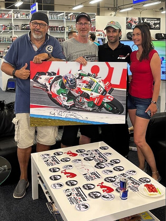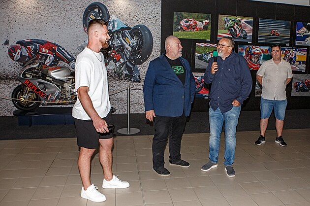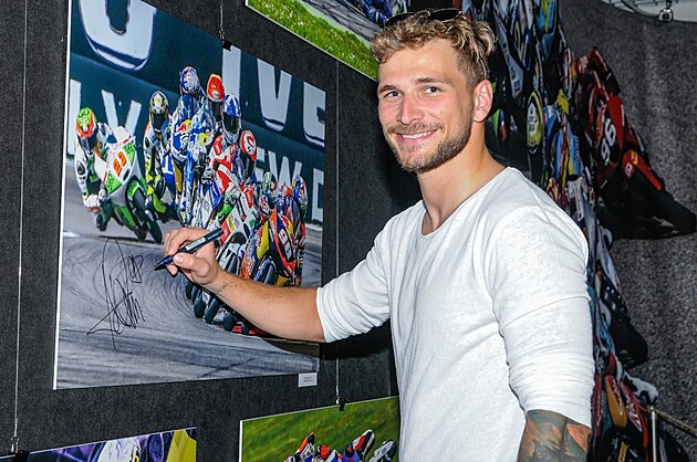 Jezdec Karel Hanika podepisuje svoji fotografii na výstavě Marka Paulíčka, brněnského fotografa a specialisty na motocyklové závody. (2025)