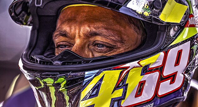 Portrét zamyšleného Valentina Rossiho. (foto z výstavy Marka Paulíčka k jeho 60. narozeninám)