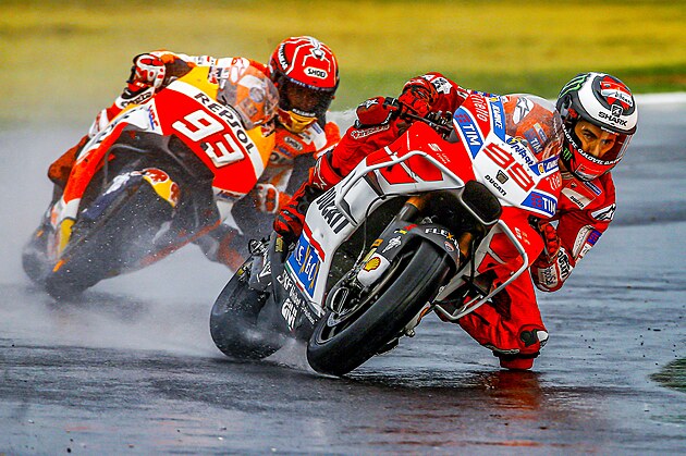 Jorge Lorenzo, Marc Márquez na trati v deštivém italském Misanu. (foto z výstavy Marka Paulíčka k jeho 60. narozeninám)