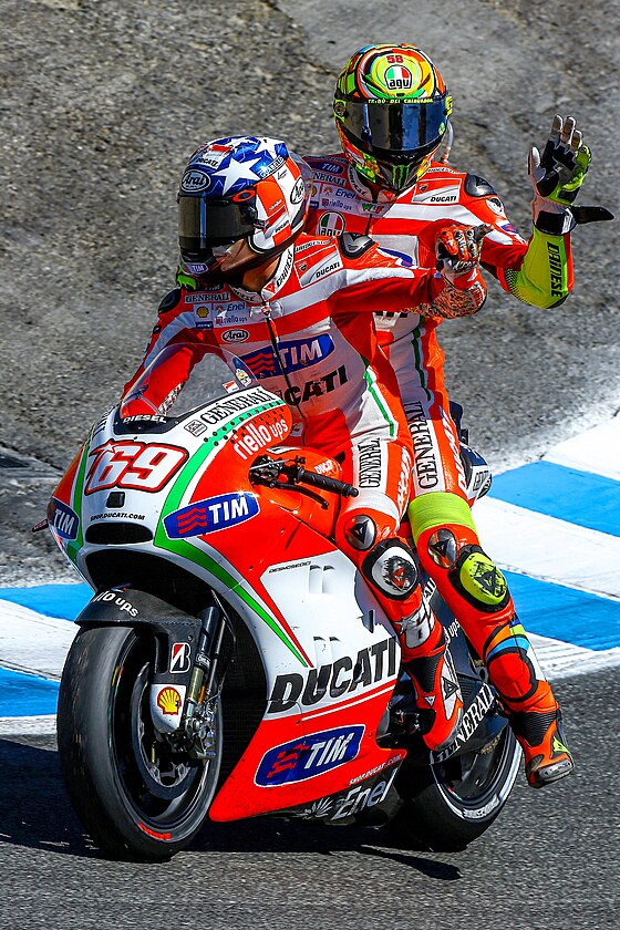 Nicky Hayden a Valentino Rossi na jednom stroji. (foto z výstavy Marka Paulíčka k jeho 60. narozeninám)