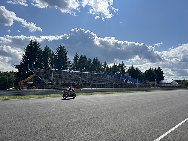 Brněnský Masarykův okruh se chystá na návrat motocyklové Grand Prix. Kolem cílové rovinky rostou sedadlové tribuny. (červenec 2025)