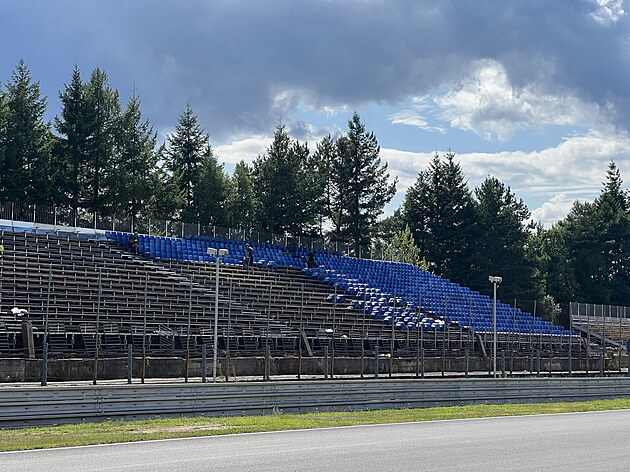 Brněnský Masarykův okruh se chystá na návrat motocyklové Grand Prix. Kolem cílové rovinky rostou sedadlové tribuny. (červenec 2025)