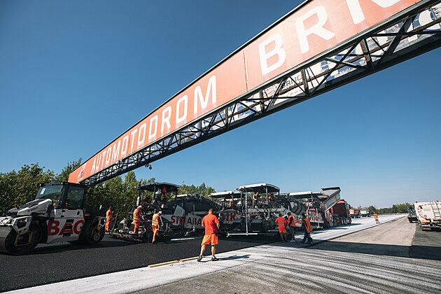 Na brněnském Masarykově okruhu se pokládá finální vrstva speciální směsi asfaltu, po kterém se budou prohánět hvězdy MotoGP. Nerovnosti na dráze jsou nepřijatelné. (2. května 2025)