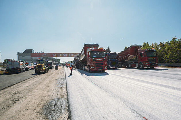 Na brněnském Masarykově okruhu se pokládá finální vrstva speciální směsi asfaltu, po kterém se budou prohánět hvězdy MotoGP. Na vrchní čtyřcentimetrovou vrstvu, která pokryje celý 5,5 kilometrů dlouhý okruh, se spotřebuje 8 tisíc tun směsi. (2. května 2025)