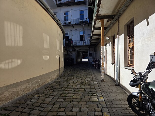 Zchátralou budovu na adrese Lidická 18 v centru Brna čeká demolice. Ve špatném stavu jsou i pavlače ve dvorní části. Objekt nahradí vyšší dům, který v mnohem větší míře využije sousední Městské divadlo Brno. (září 2025)