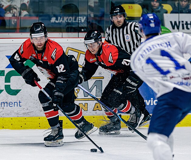 Momentka ze zápasu hokejistů Znojma (v černém) a Valašského Meziříčí ve druhé lize. (leden 2025)