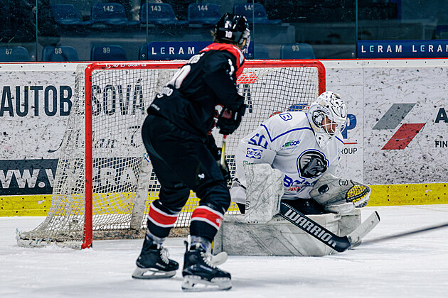 Momentka ze zápasu hokejistů Znojma (v černém) a Valašského Meziříčí ve druhé lize. (leden 2025)