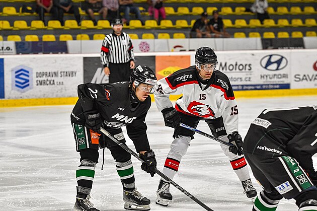 Sezona 2025/26 je čtvrtá v řadě, v níž hokejoví Orli Znojmo (v bílém) působí v českých soutěžích – v tomto případě ve 2. lize. Na snímku přípravný zápas s Hodonínem.