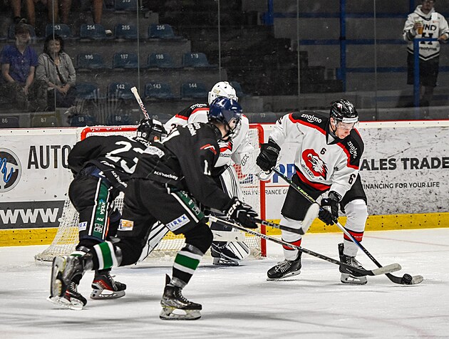 Sezona 2025/26 je čtvrtá v řadě, v níž hokejoví Orli Znojmo (v bílém) působí v českých soutěžích – v tomto případě ve 2. lize. Na snímku přípravný zápas s Hodonínem.